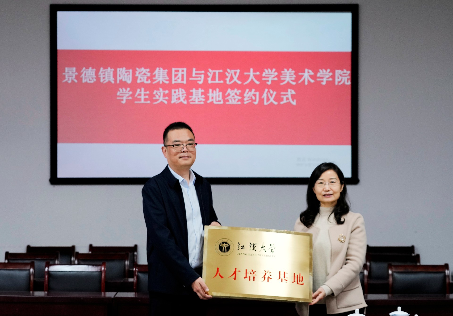 會(huì)上,舉行了江漢大學(xué)美術(shù)學(xué)院與景陶集團(tuán)“共建學(xué)生實(shí)踐基地”簽約授牌儀式。集團(tuán)人力資源部部長(zhǎng)薛景玉、江漢大學(xué)美術(shù)學(xué)院副院長(zhǎng)馬杰分別代表雙方初步簽訂了《校外實(shí)習(xí)基地建設(shè)協(xié)議書》,江漢大學(xué)美術(shù)學(xué)院副書記楊緒軍代表江大美院捐贈(zèng)《江漢大學(xué)美術(shù)學(xué)院畢業(yè)作品集》等書籍。